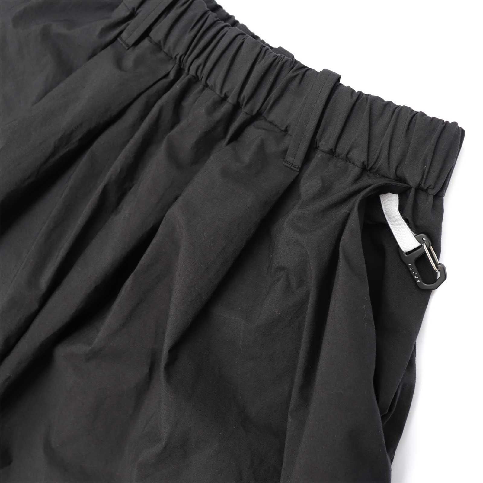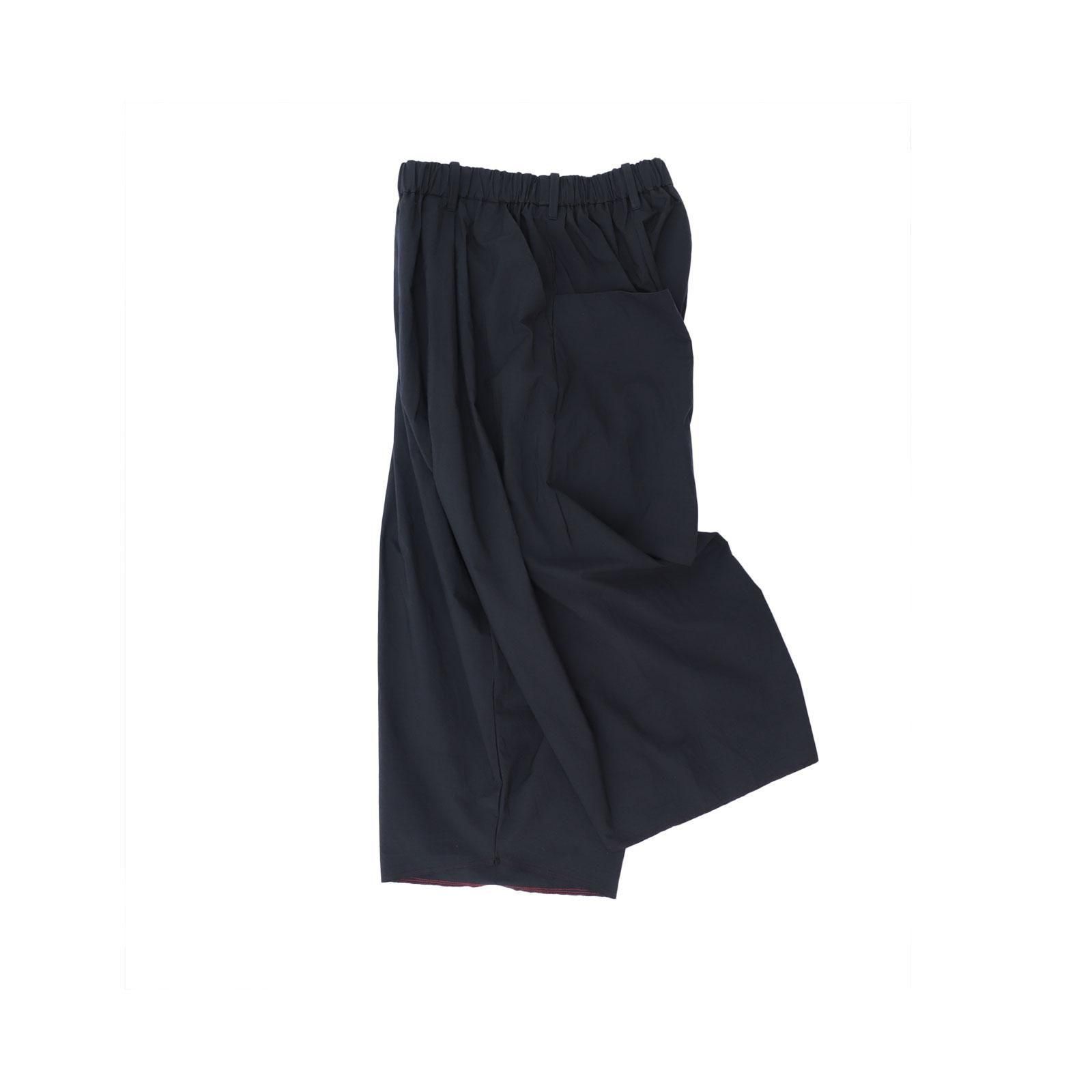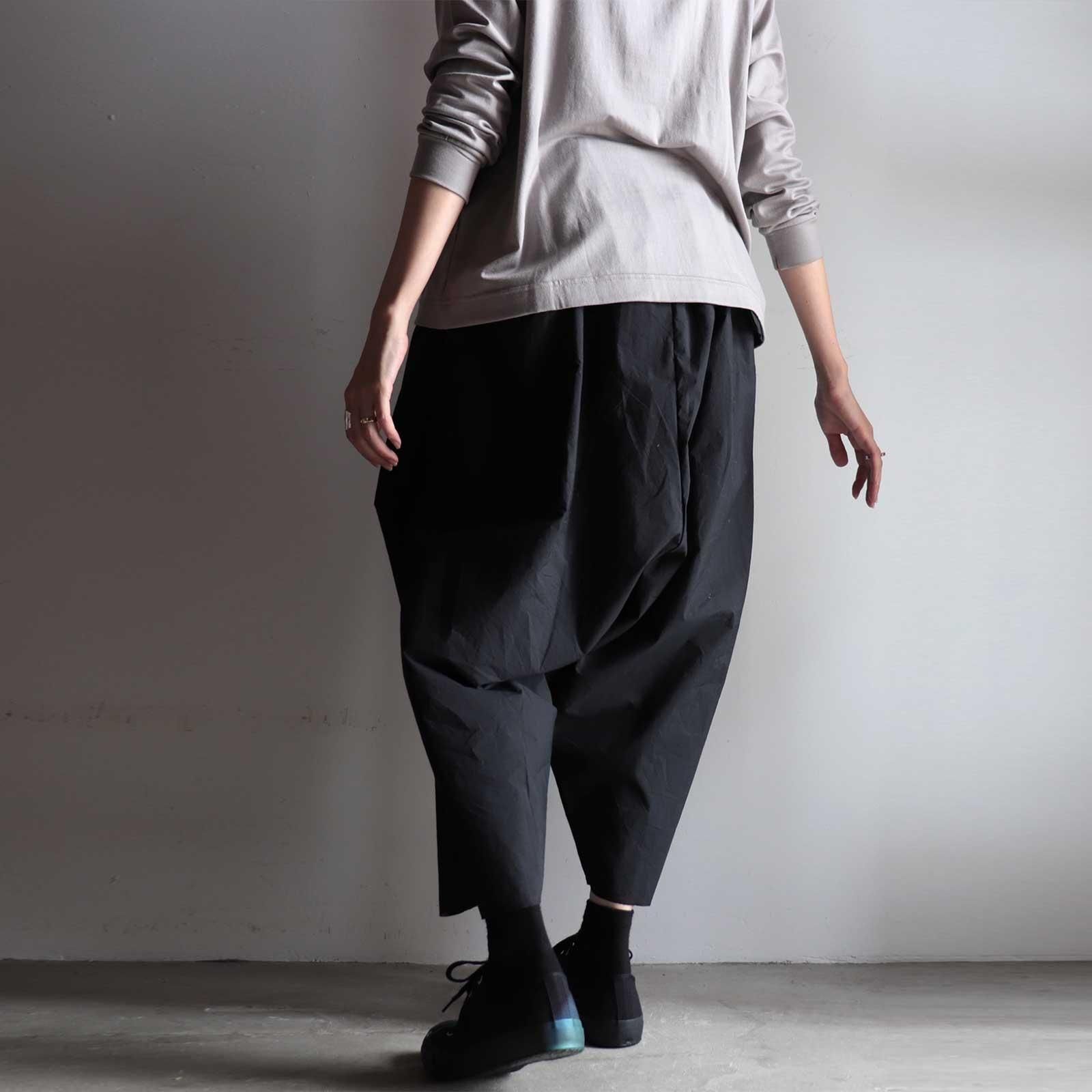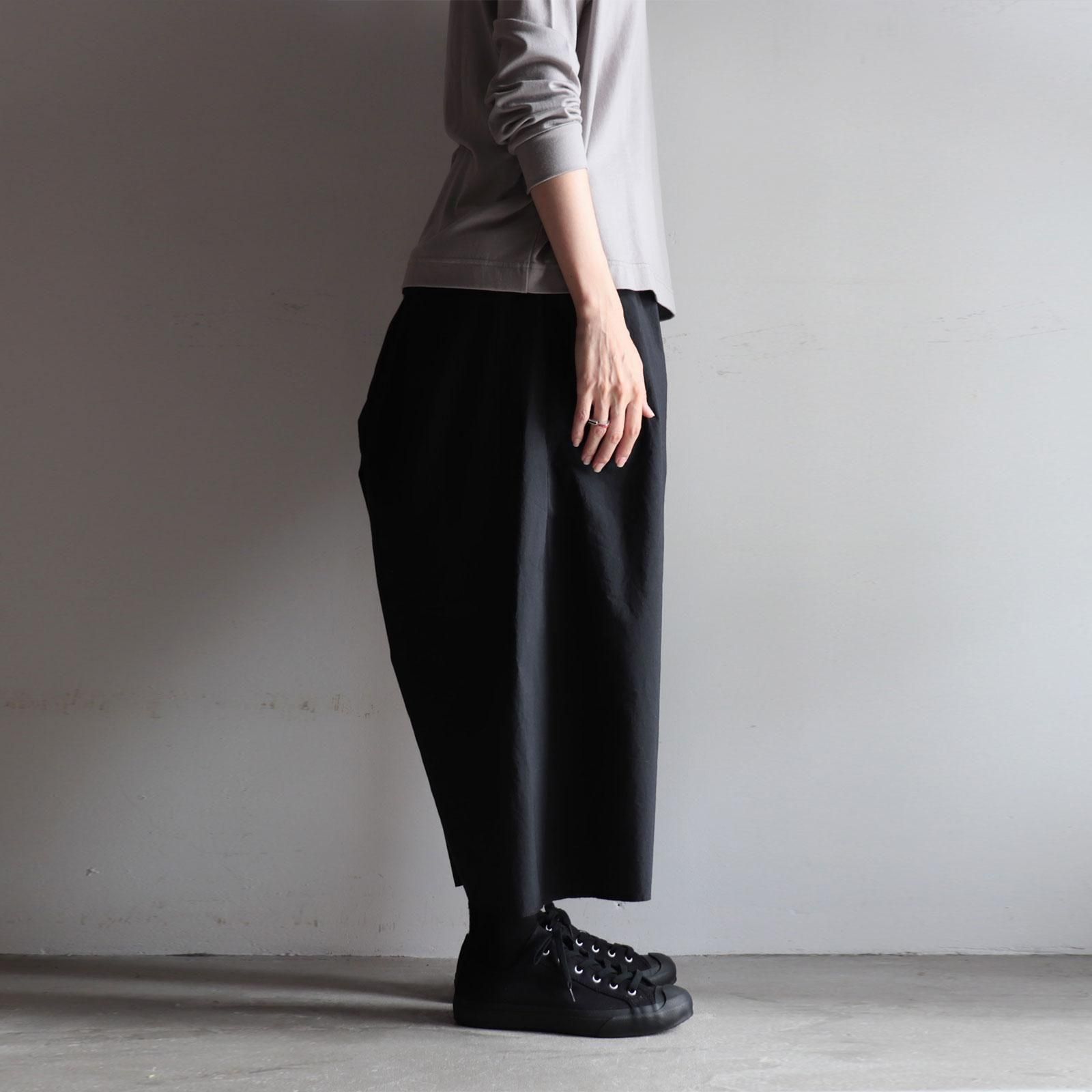名前から連想する通り、、、彼氏のズボンを彼女が着たサイズ感のズボンです。定番のチャップリンパンツのディテールはそのままにサイズ感だけで全く別のアイテムを作ってみようという試みでデザインされました。80単糸をシャトル織機を使って超高密度に織り上げてから整理加工で更に熱を加えて密度を追い込み。樹脂などの薬品を使わずにナチュラルで強烈なハリ感を感じられます。
