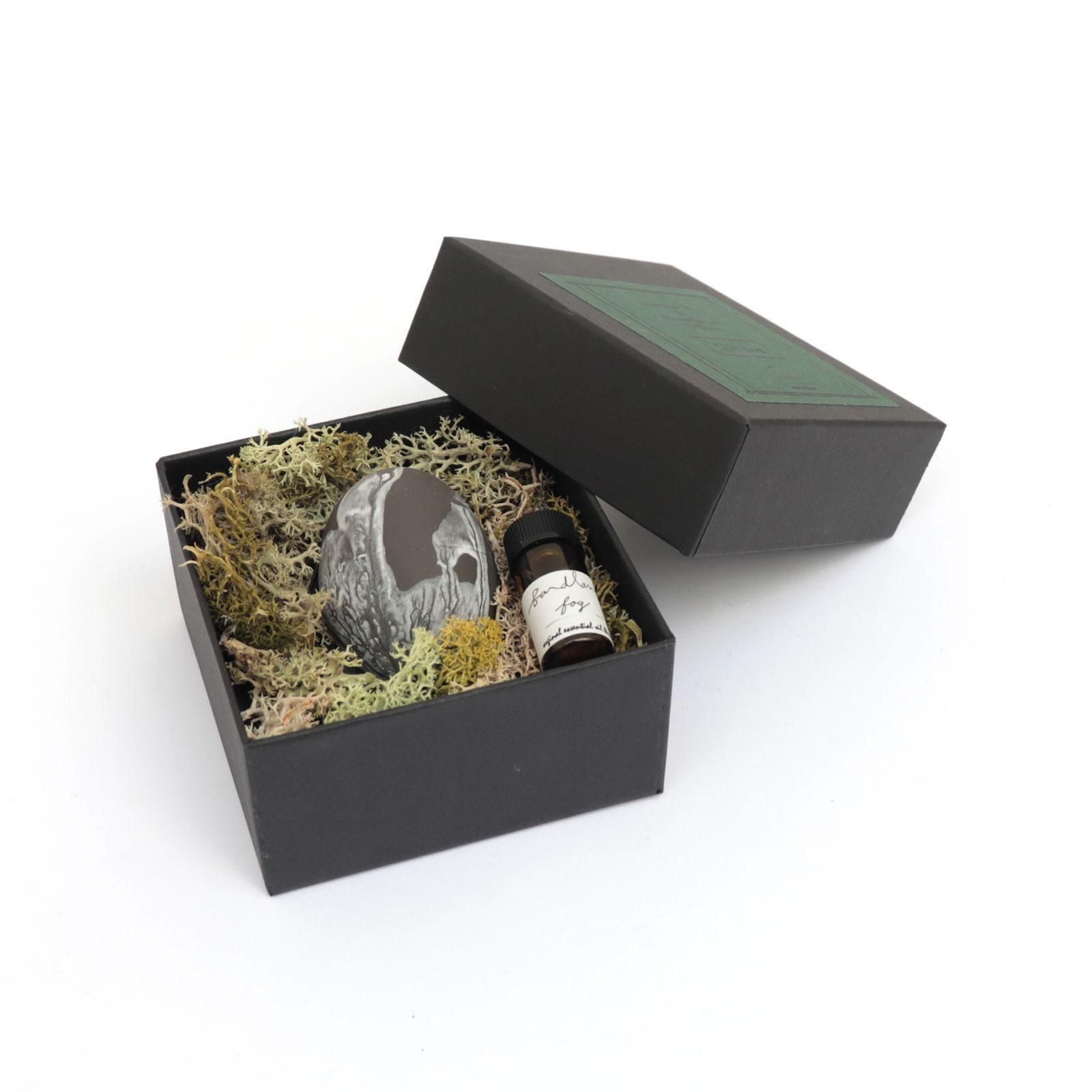 gena kuwanが描く記憶の風景を、エッセンシャルオイル「fog 2024」とディフューザー「egg」で表現し、アイスランドの苔と共に小さな箱に封じ込めました。お手持ちのお皿に、箱の中のアイスランドモスをのせ、その上にディフューザー「egg」をそっと置きエッセンシャルオイルを垂らす。
