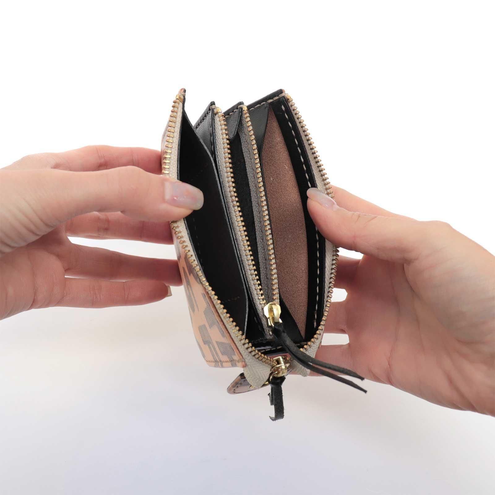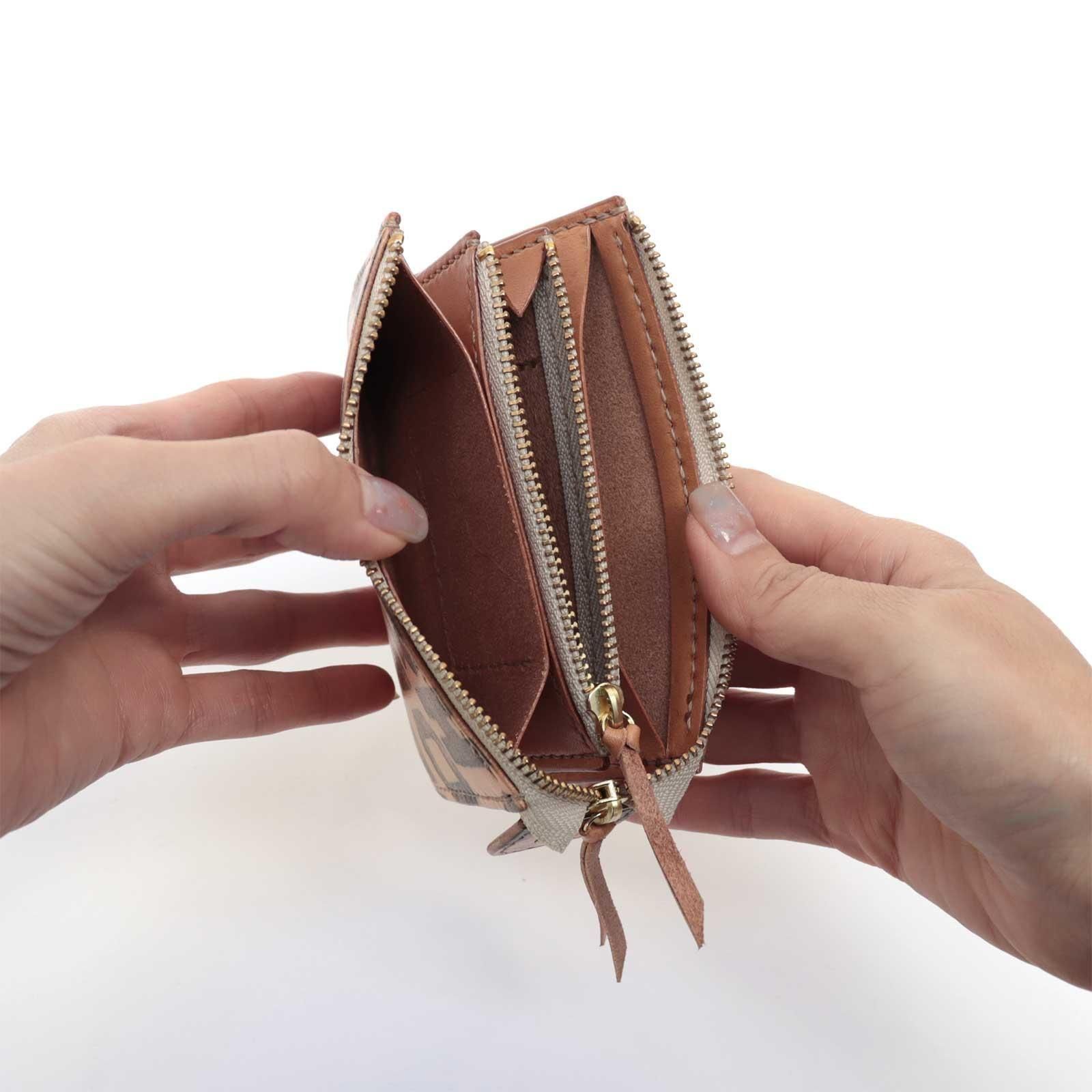 真ん中の小銭入れを対称に両サイドに収納がついているので、ジッパーを引いて開ける向きでも、押して開ける向きでも同じ形になるので、ご自身の開け方の癖、利き手に合わせてお好きな向きでお使いいただけます。