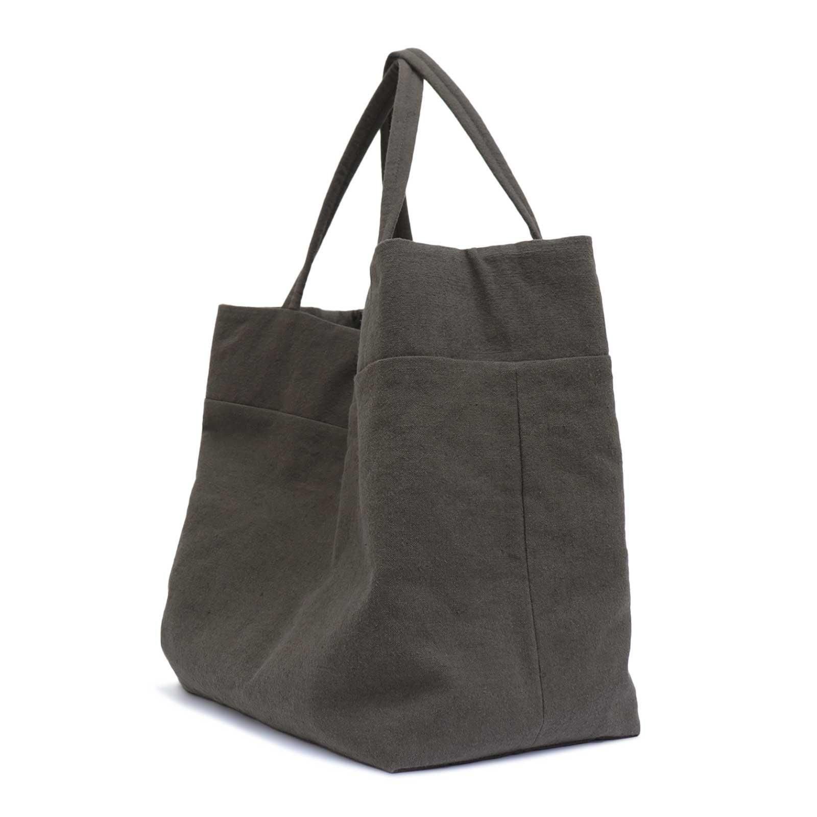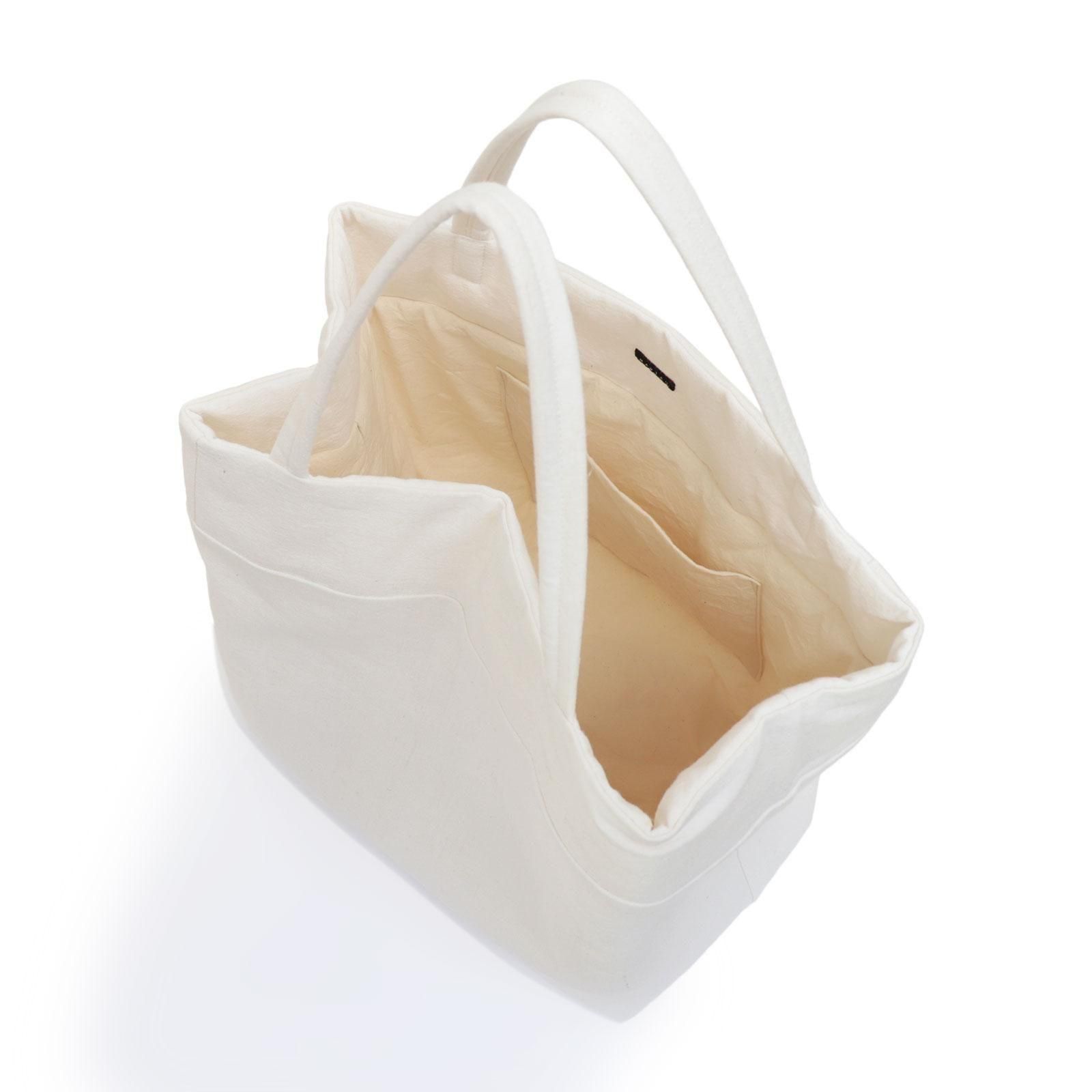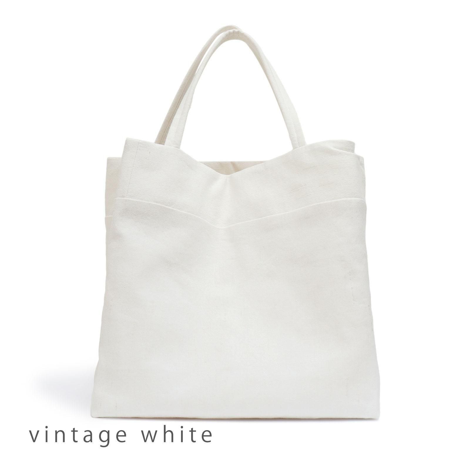 1960~90年代フランスのベッドリネンを使って作られてたバッグ。長い期間使用され、繰り返し洗われる事により元の麻の生成り色が抜け、白くなったものだけを厳選して使われています。当時のまばらな太さの糸で編まれたムラ感のある麻生地は使い込むことによって、更に凹凸のあるくったりとした質感に育っていくそう。デザイナーが1点ずつ作るハンドメイドのバッグです。
