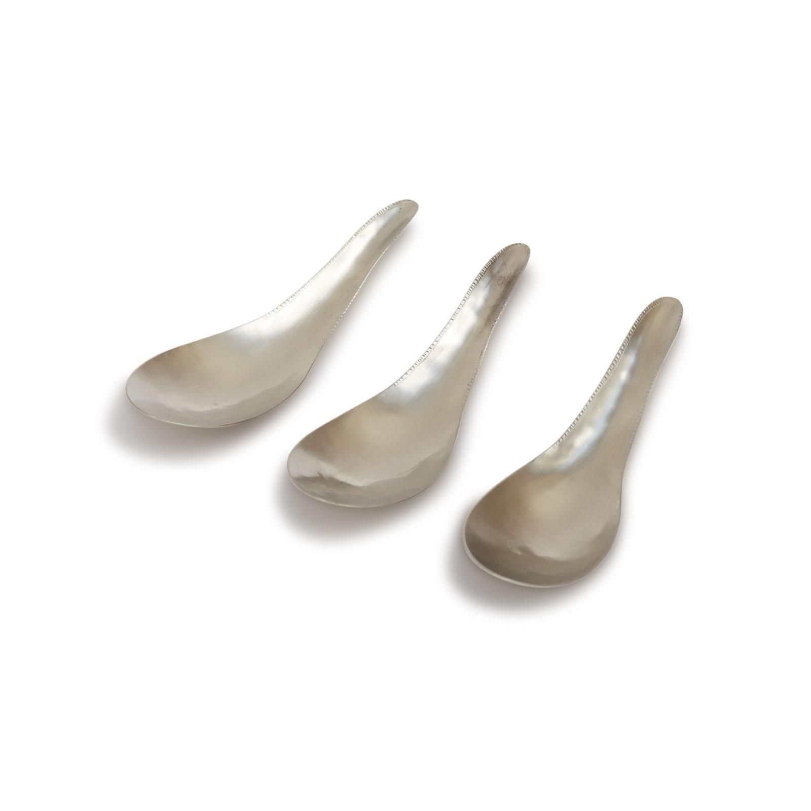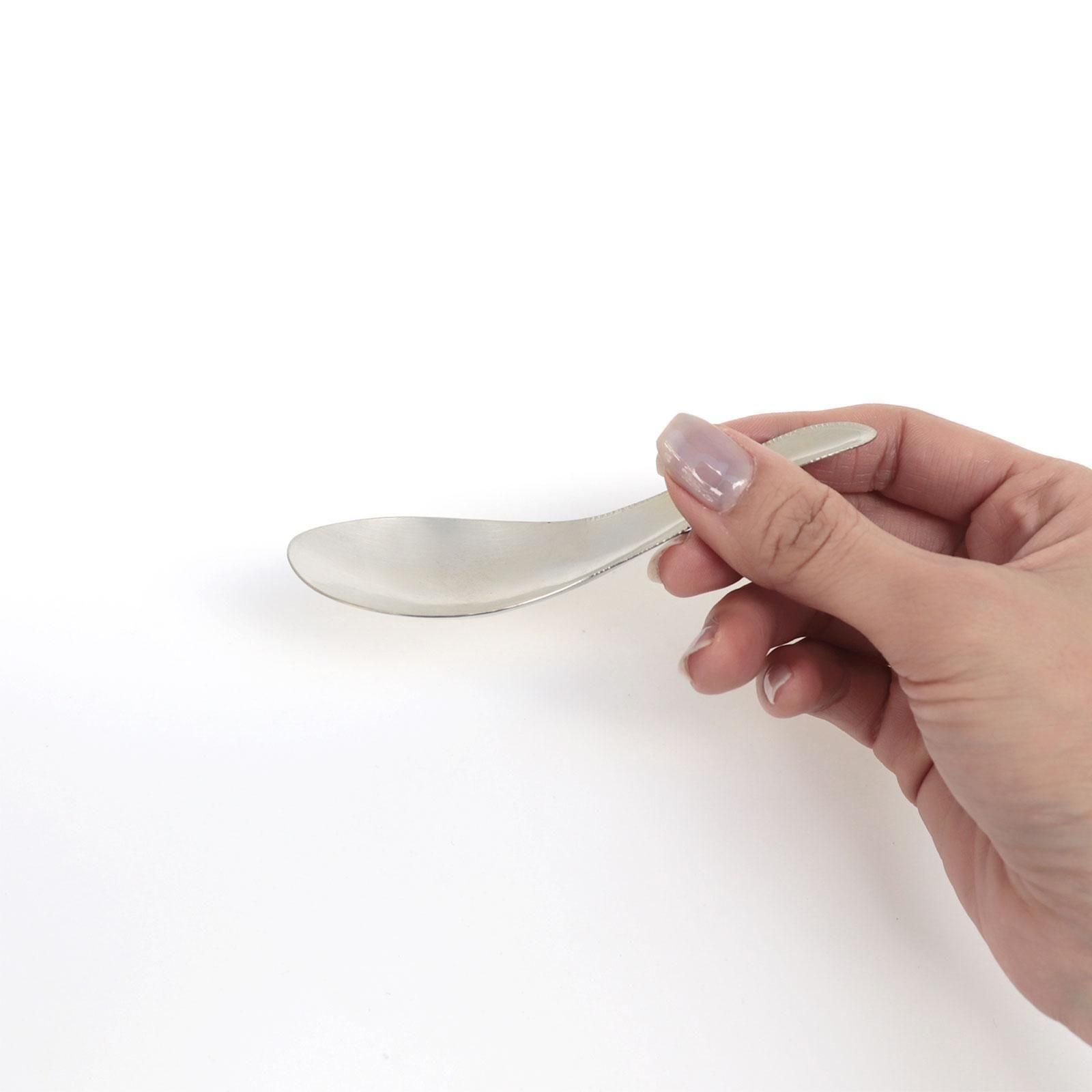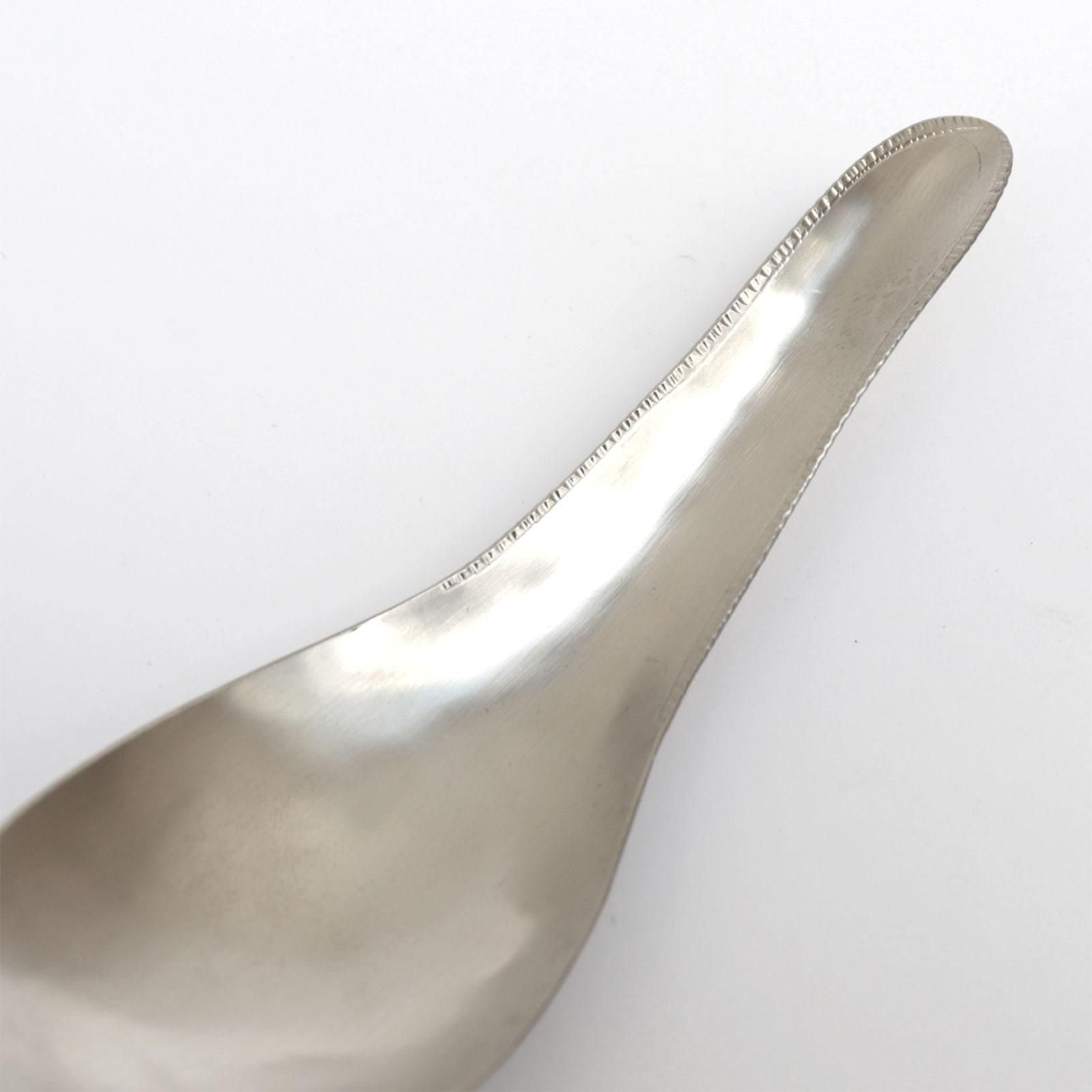 新潟在住の金工作家・大桃沙織さんとの協議で生まれた鍛金のレンゲ。立体的なフォルムが特徴。柄には細かい紋様が刻まれています。銅と亜鉛とニッケルの合金である洋白で作られたレンゲは、金属特有の味もなく、熱いものでもお使いいただきます。